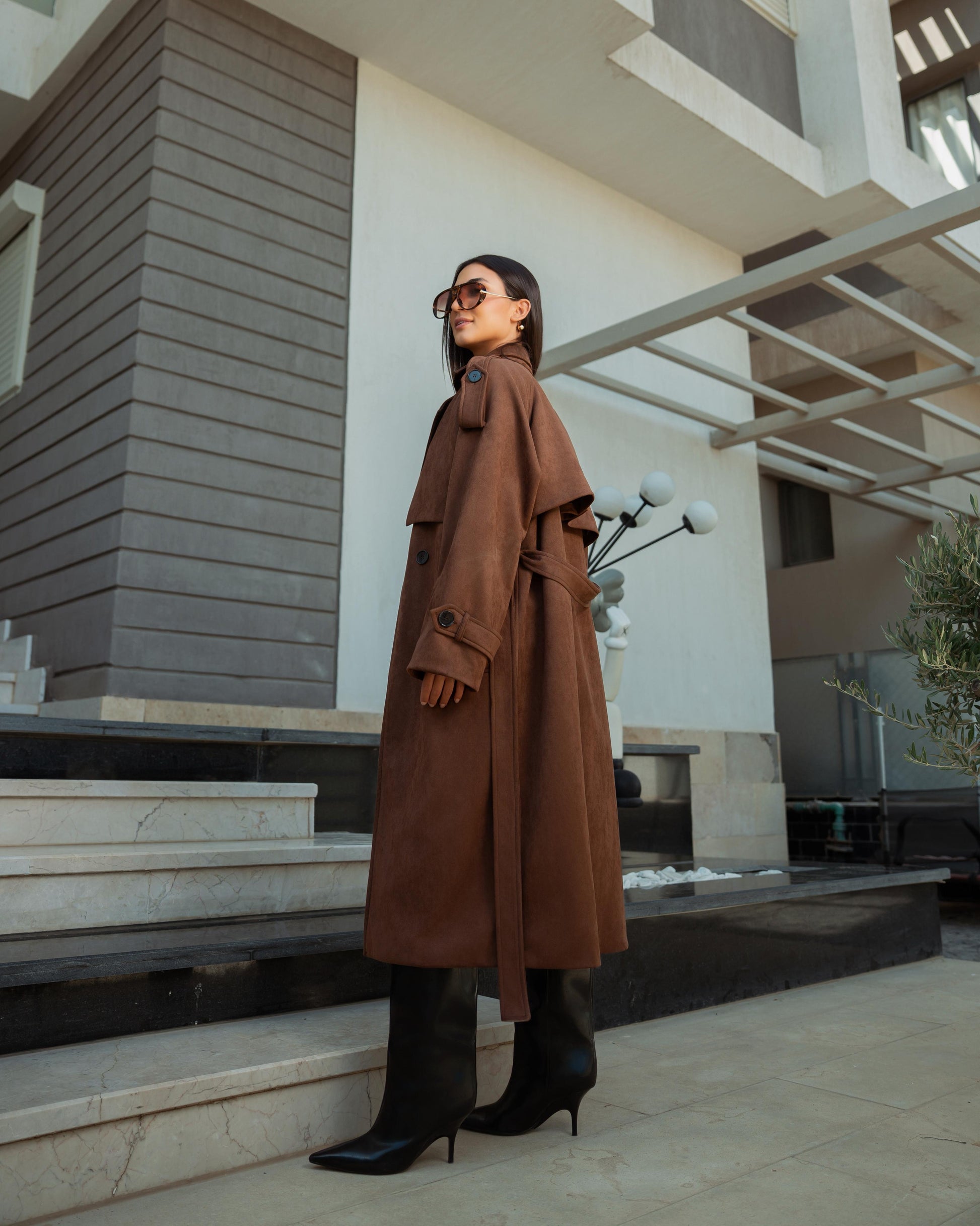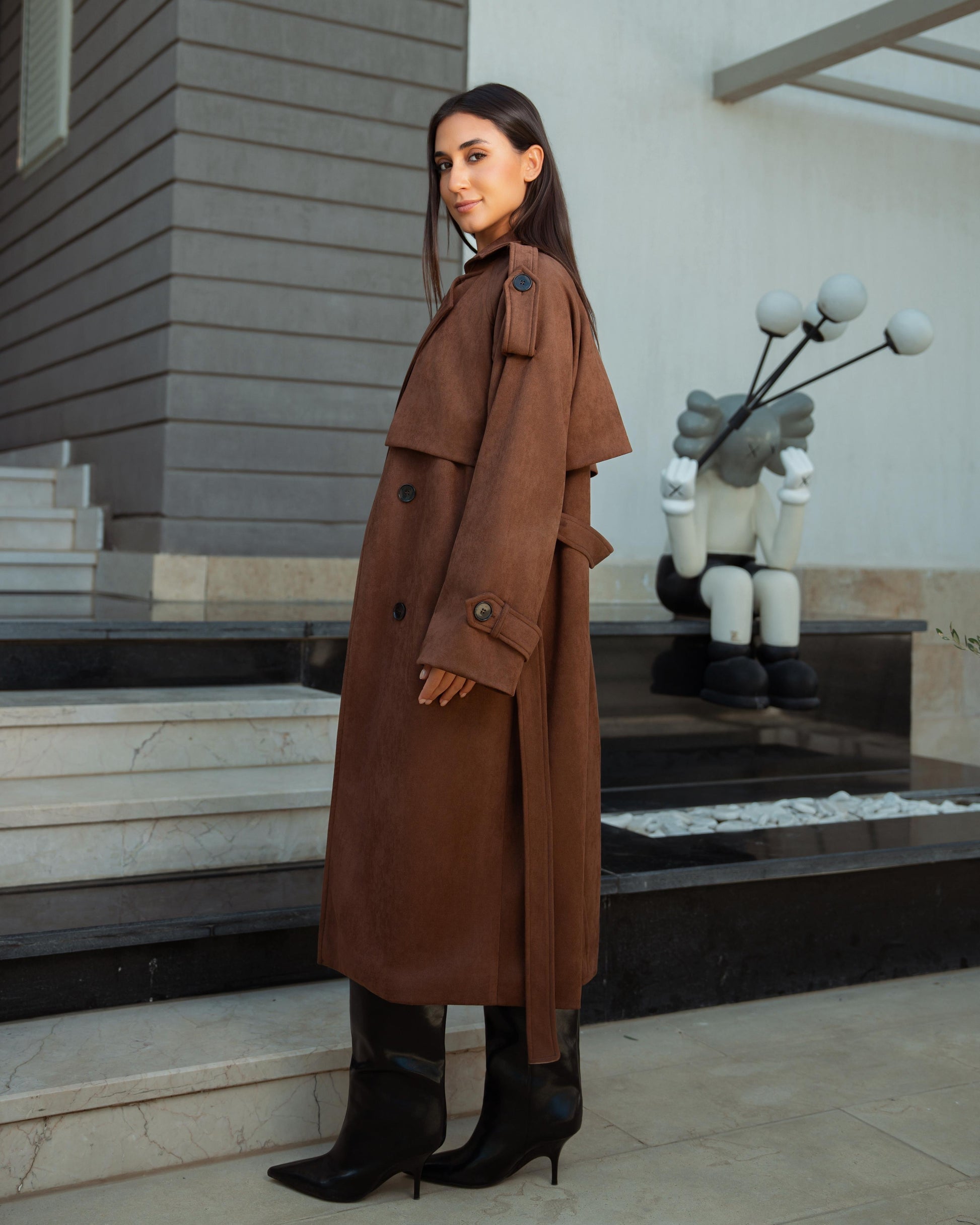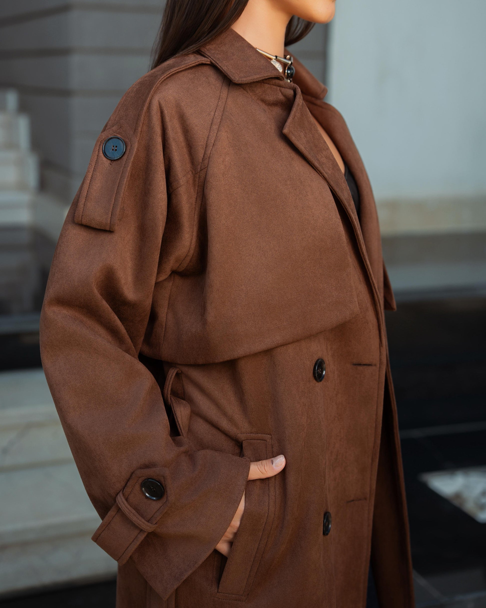 A soft suede trench coat with a refined, structured silhouette. Elegant yet modern, perfect for effortless layering and elevated everyday looks.